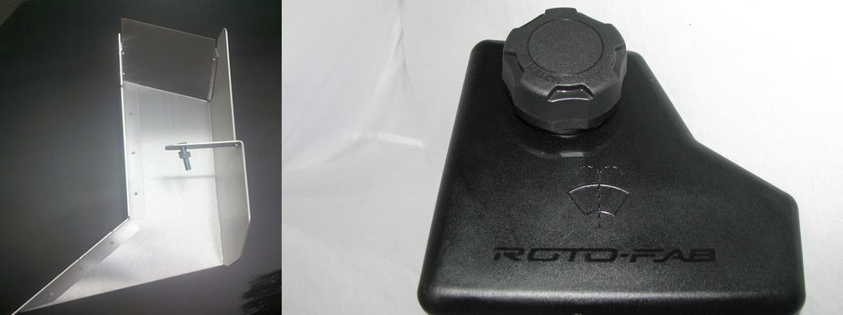 This kit includes a JRE Race Scoop as well as the Roto-fab washer bottle kit This is a complete relocation kit including all hardware, hoses, in-line filter, remote pump mounting bracket and detailed instructions. The resrevoir is custom molded to fit your Camaro perfectly. For mounting, it utilizes the vacant stud along with an unused hole lower on the body. The tank has molded-in threads for the supplied internally vented cap as well as a molded-in brass insert for the outlet fitting to engage. We supply a rubber cushion mounting bracket with a stainless steel bolt which mounts the factory pump to one of threaded holes previously used to mount the stock reservoir. This location allows use of the original wiring without lengthening or modifying. The instructions assume you are installing an JRE scoop.